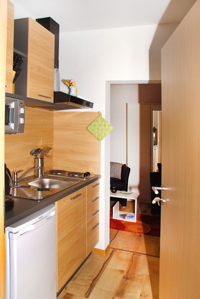 - kleine Einbauküche (Kühlschrank, Gefrierteil, Kochfeld, Kaffeemaschine, Wasserkocher und Toaster)