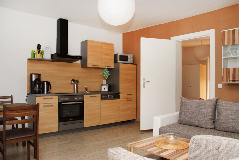 - geräumige Einbauküche (Geschirrspüler, Kühlschrank, Gefrierfach, Kochfeld, Backofen, Mikrowelle, Kaffeemaschine, Toaster, Wasserkocher)